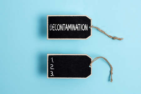 Sign displaying Decontamination. Concept meaning neutralizing every presence of hazardous substances Collection of Blank Empty Sticker Tags Tied With A String For Information Label Sign