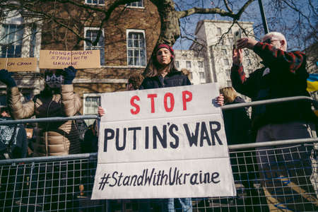 Downing Street, London | UK - 2022.02.26: Ukrainian people protest, thousands gather to demand tougher sanctions on Russia from British Government, EU and USA to stop the war in Ukraine