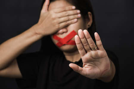 Woman blindfold wrapping mouth with red adhesive tape and show hand sign stop abusing violence and abuse on black background, Human trafficking and abuse, International Human Rights day
