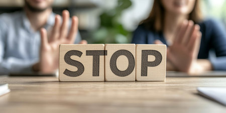 Stop. Wooden cubes spell the word stop as a man and woman hold up their hands in a stop gesture.