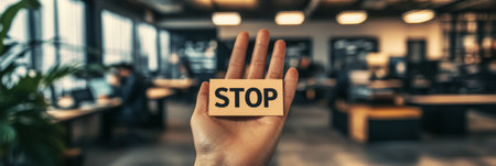 Close-Up Woman s Hand Holds STOP Sign, Blurred Modern Office in Background, Harassment Concept