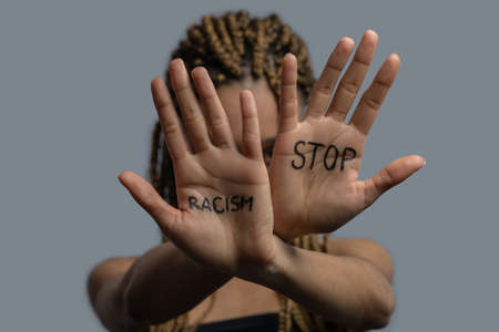 Stop racism. Young African American woman hiding her face with crossed palms, showing stop racism lettering