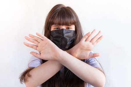 Girl in isolation. Protective medical mask on the face against Coronavirus. Stop COVID-19