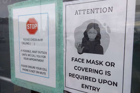 Toronto, Ontario, Canada - 03/16/2021: A notice sign instructs visitors to wear a face mask as a stipulated health precaution at the entrance of the medical clinic.