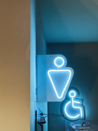Glowing neon restroom signs displaying an elegant design, featuring the accessibility icon and a geometric representation of a figure. Perfect for illustrating modern signage themes