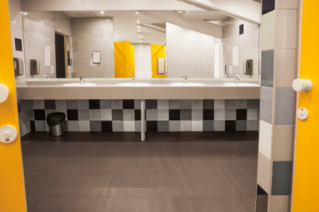 Interior of bathroom with sink basin faucet lined up and public toilet urinals, Modern design.