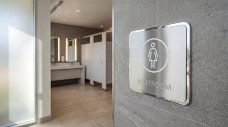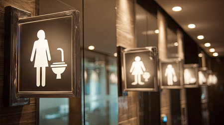 This image features modern restroom signage designed for both men and women. The clear symbols and contemporary style reflect hygiene and accessibility in urban settings.