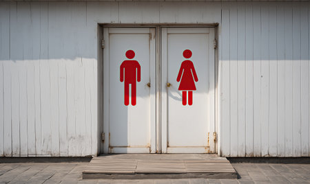 Male symbol female symbol restroom door public toilet gender sign red icon white wall wood panel minimal design outdoor facility calm