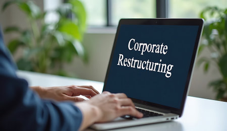 Person types on a laptop displaying 'Corporate Restructuring' for finance analysis at work.