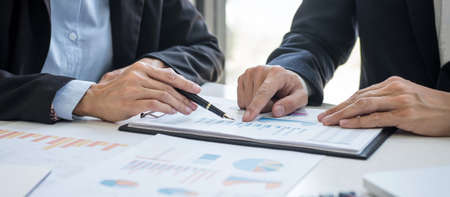 Teamwork of business colleagues, consultation new strategy plan business and market growth on financial document graph report, conference to making growth profit, Partner meetings and briefing.