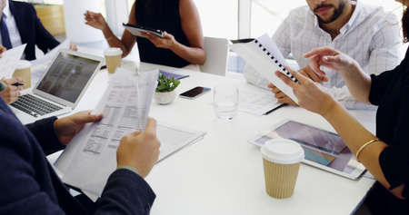 Business corporate management planning team concept, people sitting around office table and working with financial data reports