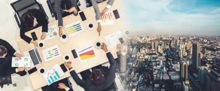 Business people group meeting shot from top view in office . Profession businesswomen, businessmen and office workers working in team conference with project planning document broaden view .