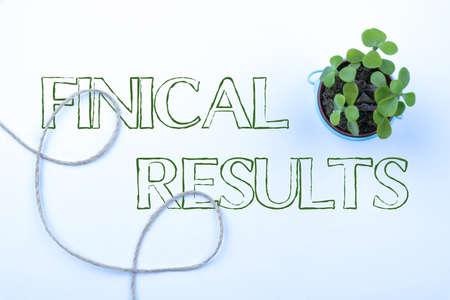 Hand writing sign Finical Results. Concept meaning written records that convey the business activities Multiple Assorted Collection Office Stationery Photo Placed Over Table