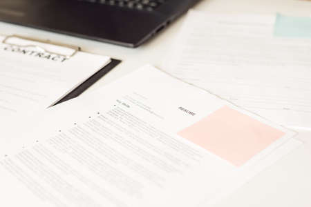 Top view of stack of office documents including resume and cv forms on the desk. Job seeking process. Hunting for workplace concept