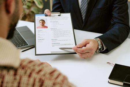 Close up view of job interview in office, focus on resume writing tips, employer reviewing good cv of prepared skilled applicant, recruiter considering application, hr manager making hiring decision