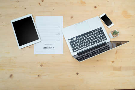 Office table with Laptop, tablet, smartphone and resume information. Job search concept, View from above office table.