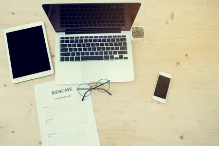 Office table with Laptop, tablet, smartphone and resume information. Job search concept. View from top on office table.