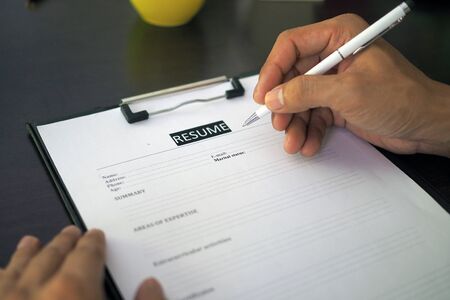 Job seekers, men are filling out a resume on the form. Company launches new employee and Recruitment company.