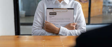 Female job applicants presenting a resume in the hands of a manager, presenting their ability to apply for the interviewer to see the ability and attitude of the candidate to consider for employment.