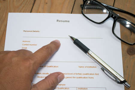 Resume on the Table,Closeup hand on resume with pen and glasses on the table