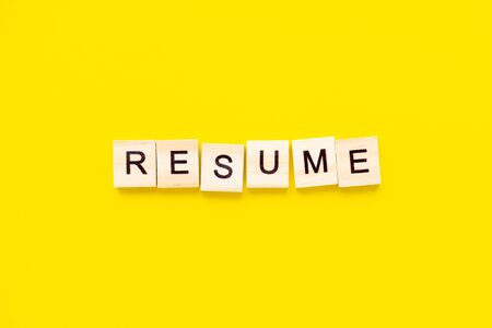 word resume. Wooden blocks with lettering on top of yellow background. Human Resource Management and Recruitment and Hiring concept.