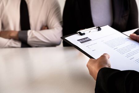 Human resources department manager reads CV resume document of an employee candidate at interview room.