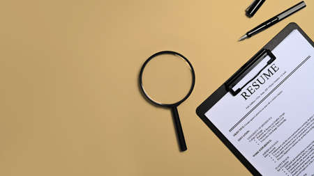 Close-up of resume with magnifying glass, computer laptop and pen on wooden background