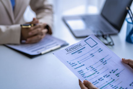 Close-up of resume lying in front of female interviewer, image taken from behind applicant's back