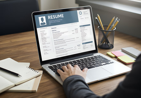 Personal laptop, next to the CV and a card with the text job interview. Job Search, Engagement in Job Search, and Job Interviews.