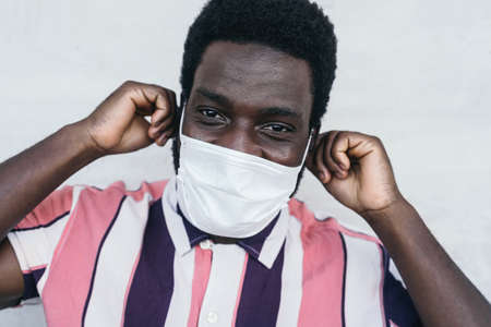 Young African man wearing face mask portrait - Afro American boy using protective facemask for preventing spread of corona virus - Health care and pandemic crisis concept