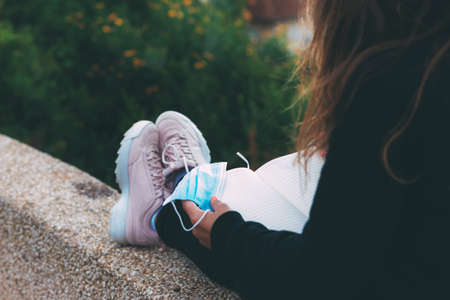 Side photo of blank notebook in female hands together with a pen and blue medical mask on left hand, sitting in a park. Life after quarantine of epidemic pandemic. New reality. Space text