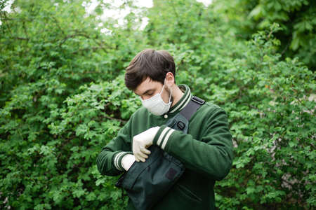 A young man holds a medical mask in his hands. Protection and Prevention COVID-19