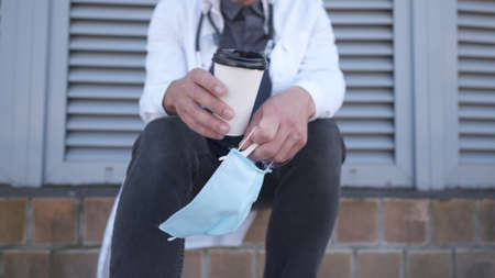 Close-up of hand with cup of coffee and protective medical mask. Tired, exhausted doctor in medical white coat during coffee break outdoors hospital in morning.