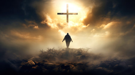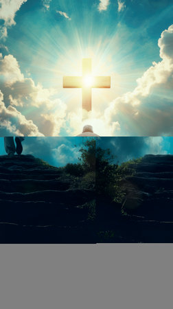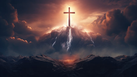 The Holy Cross, symbolizing the death and resurrection of Jesus Christ with the sky above the hill of Calvary, is shrouded in light and the concept of the apocalypse. Easter