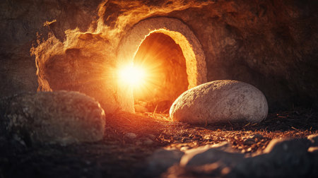 A symbolic image of an empty tomb with a large stone rolled away, with sun rays shining down, signifying Christ's resurrection -