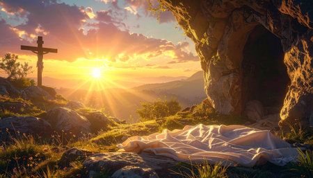 A serene image capturing the sunrise over a rocky hillside. A wooden cross stands prominently near an open tomb, with a white cloth draped over the edge. The scene is bathed in the