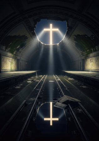 A vertical composition depicts a glowing Christian cross emanating light from a circular opening in the ceiling of a derelict underground tunnel.