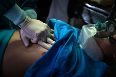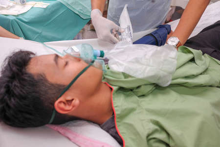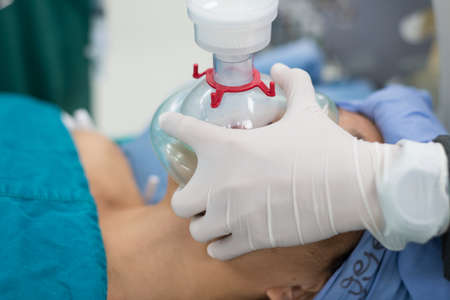 Closeup hands of doctor and assistant holding oxygen mask with patient emergency in the operation room at hospital, surgeon healing and surgery, problem of breathing, instruments medical and health.