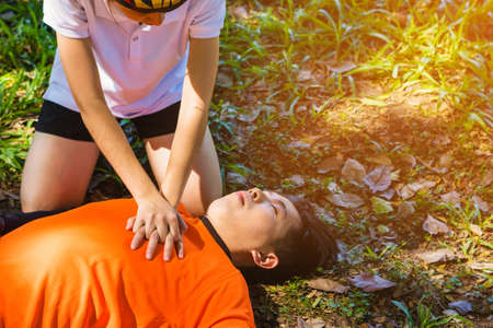 Girl making cardiopulmonary resuscitation to an unconscious guy after heart attack