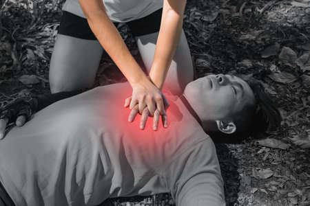 First Aid Emergency is CPR.The man who face heart attack and shock was helped by his friend after the bicycle race. A woman who is his friend give CPR to save his life.Photo concept Emergency and CPR.
