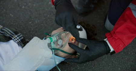 Paramedic using oxygen mask to help unconscious woman