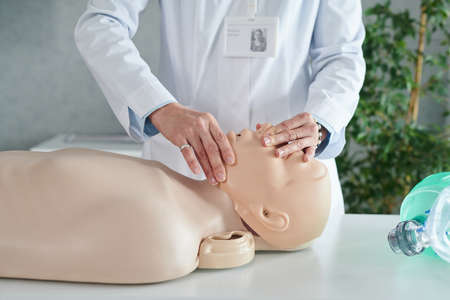 Close-up of female doctor in white coat showing how to make artificial respiration on mannequin at seminar