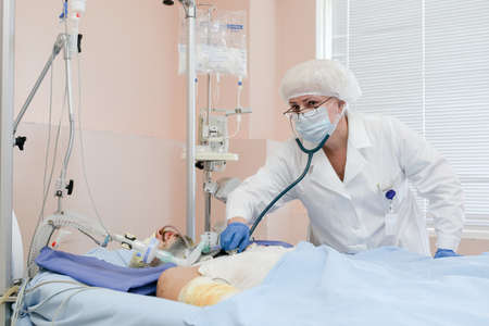 Patient wear a medical ventilator lying on the surgical bed in the operating room with surgeon stand by his side to keep an eye on the symptoms at hospital in night time in banner with copy space