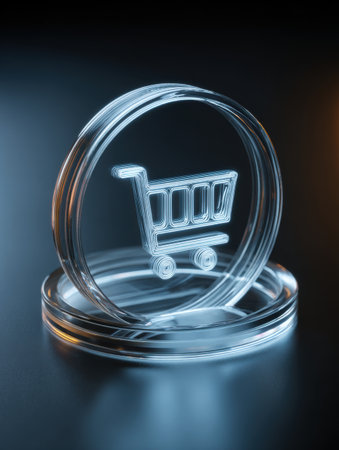 A translucent shopping cart symbol is placed on a sleek, illuminated surface, showing modern e-commerce elements in a visually appealing manner.