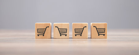 online ordering business,Image of shopping cart mockup with cardboard boxes and wooden boxes for shopping icons.
