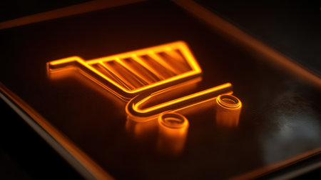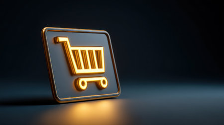 A stunning 3D illuminated shopping cart icon against a dark background, ideal for illustrating online shopping and e-commerce themes in various projects.