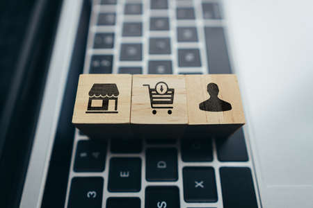Concept online trading and shopping. Cart and shop icons with persona on cubes with laptop