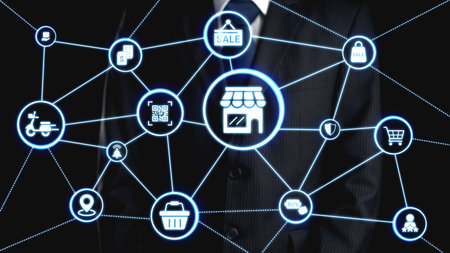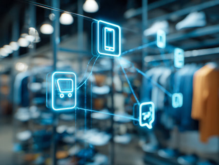 A sleek, holographic display with networked symbols floats over a softly blurred retail environment, embodying cutting-edge technology transforming shopping experiences.