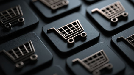 Array of shopping cart icons displayed on a dark surface highlights the significance of ecommerce. This design symbolizes the growing trend in online shopping and consumer engagement.