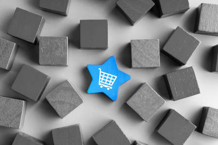 Business sale growth and expand shop franchise concept, wooden cube block which print screen chart and shopping trolley cart on table.
